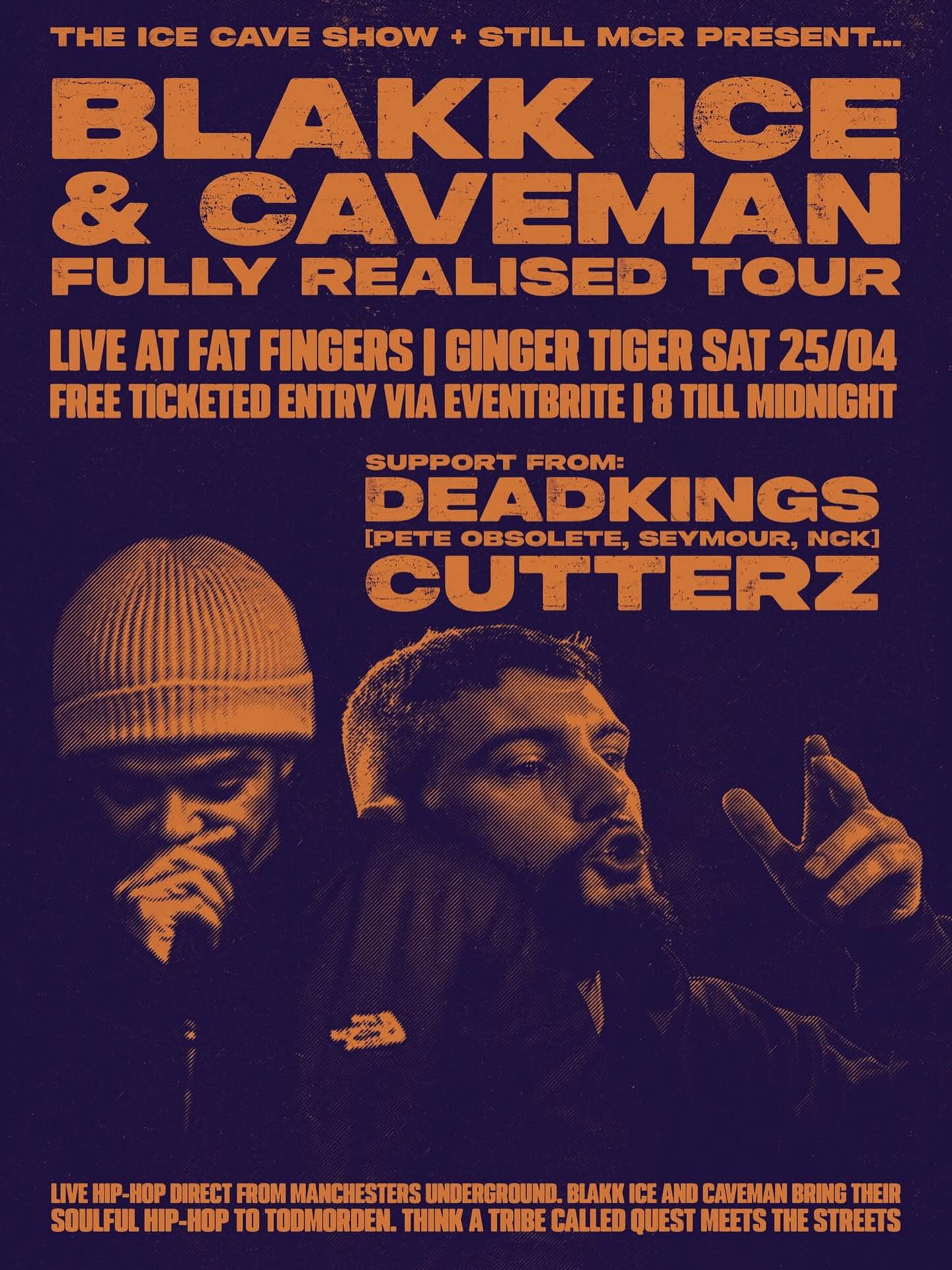 Reprezentanci podziemia z Manchesteru zagrają materiał z najnowszej EP'ki, a ich brzmienie organizatorzy określają jako połączenie A Tribe Called Quest z The Streets. Blakk Ice kojarzony jest w lokalnym środowisku ze swojej wszechstronności oraz udziału w głośnym cypherze z Kendrickiem Lamarem w 2016 roku. Caveman to z kolei freestyler i raper bitewny, udzielający się na platformach takich jak PenGame czy Premier Battles. Jako support na scenie pojawią się kolektyw Deadkings (Pete Obsolete, Seymour, NCK) oraz producent Cutterz.