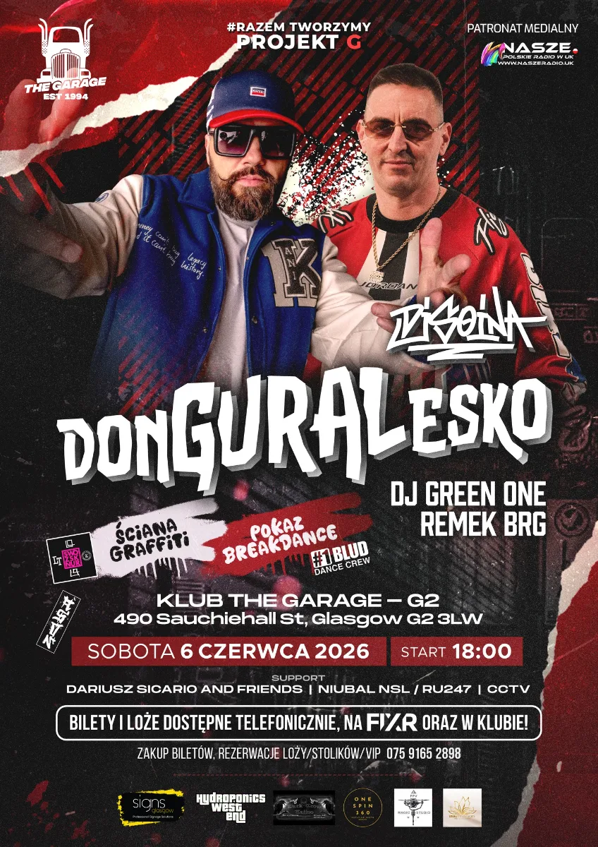 W sobotę, 6 czerwca 2026 roku, klub The Garage w Glasgow zamieni się w stolicę polskiego hip-hopu. Projekt G organizuje koncert, podczas którego gwiazdą wieczoru będzie donGURALesko (DGE) wspierany przez DJ'a Soinę.