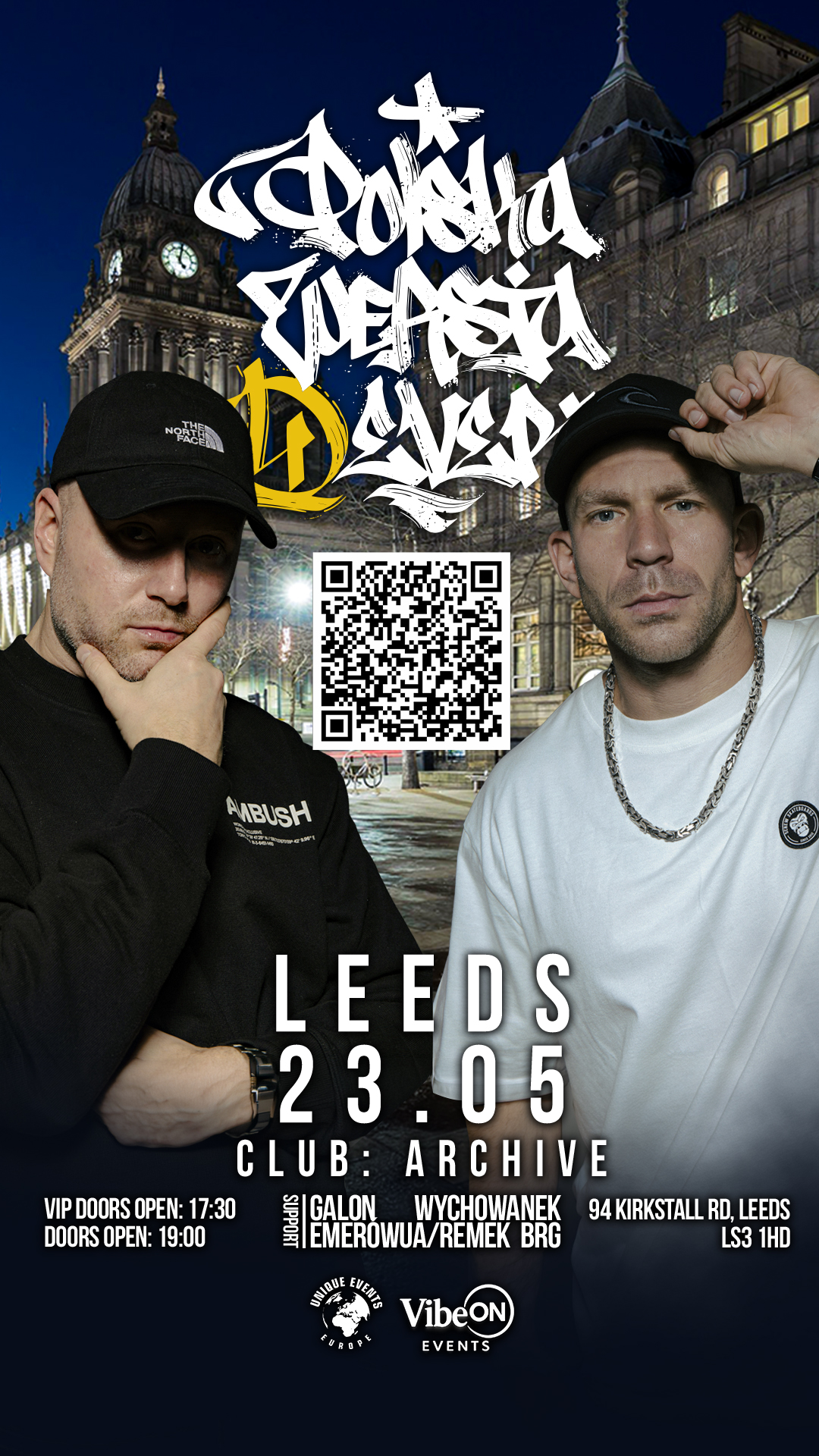 - Leeds (23 maja): Dzień po koncercie w Londynie artyści przeniosą się na północ, gdzie zagrają w klubie Archive. Ten koncert jest przeznaczony wyłącznie dla osób pełnoletnich (18+). Przed główną gwiazdą wystąpią: GALON Wychowanek, Emerowua / Remek BRG.