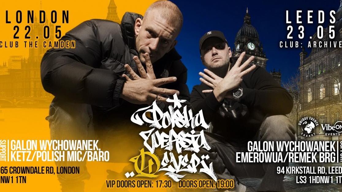 - Londyn (22 maja): Koncert odbędzie się w klubie The Camden. Wydarzenie przeznaczone jest dla osób od 16. roku życia (niepełnoletni wchodzą tylko z osobą dorosłą). Na scenie w roli supportu pojawią się: GALON Wychowanek oraz KETZ / Polish Mic / Baro.